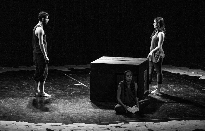 La poesía tiene su momento en una escenografía en la que aquellas cartas que se escribieron los amantes, forman parte del piso en el cual ocurren los hechos. En el medio, un cubo de importantes dimensiones será la única y excelente escenografía que usará la obra para crear todo un universo.